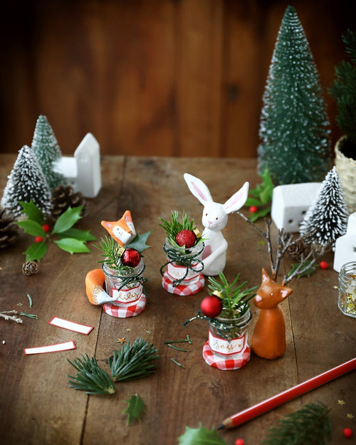 Formez des minis-bouquets, avec du houx et du sapin par exemple, pour venir décorer les petits pots Bonne Maman. Rajoutez quelques étoiles et minis décos de Noël. -