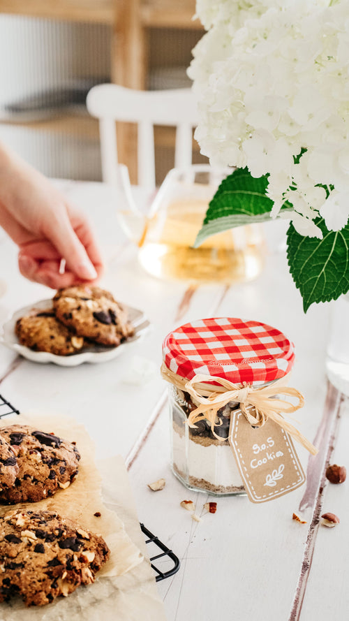 Perforez et accrochez l’étiquette autour du pot à l’aide de raphia. - Votre S.O.S Cookies est prêt à offrir.