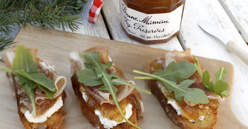 - Tartinez ensuite chaque crostini de fromage de chèvre, ajoutez une bonne cuillère à thé de Confiture de Figues Bonne Maman.