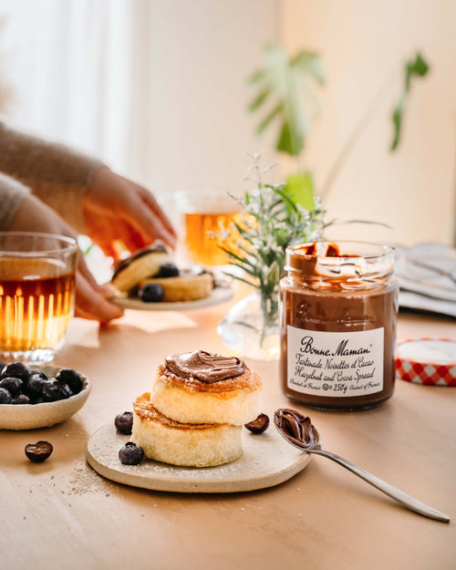 - Avant de servir, pour plus de gourmandise, tartinez vos pancakes avec de la Tartinade Noisettes et Cacao Bonne Maman.