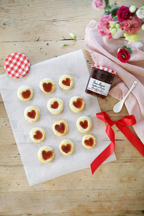 - Badigeonnez de jaune d'œuf les sablés et remplissez les cœurs de Confiture Bonne Maman.