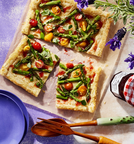 - Cuire au four pendant 15 minutes ou jusqu’à ce que la pâte soit dorée et que les asperges soient tendres. Laisser refroidir 5 minutes avant d’ajouter une poignée de microverdures fraîches et un filet de confiture de fraises Bonne Maman, au goût.