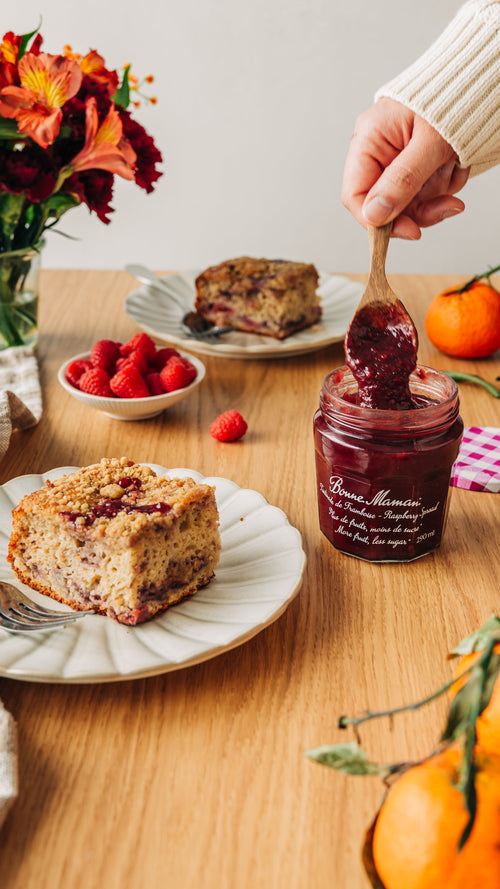 - Assembly Spread half of the batter in the pan, add half of the Bonne Maman spread and swirl with a knife. Repeat layers, finishing with the streusel on top.